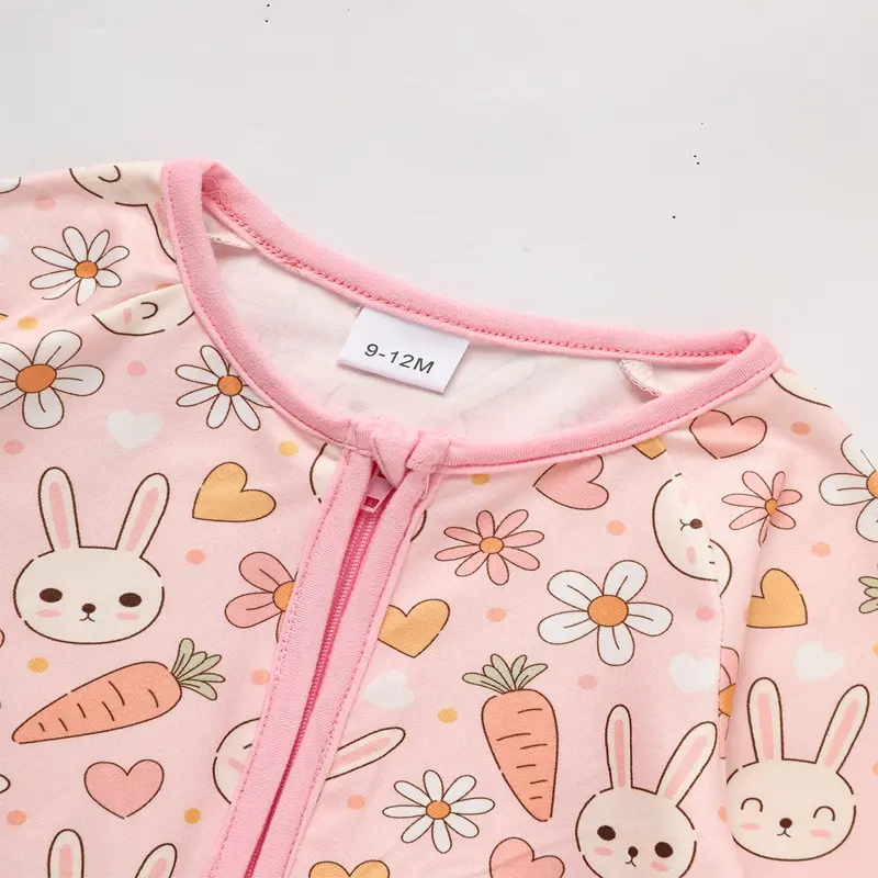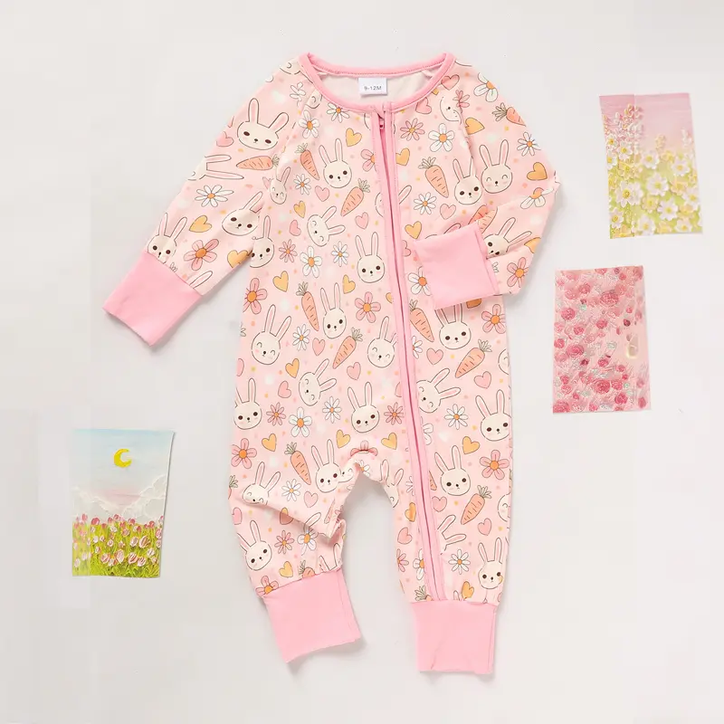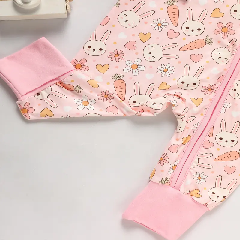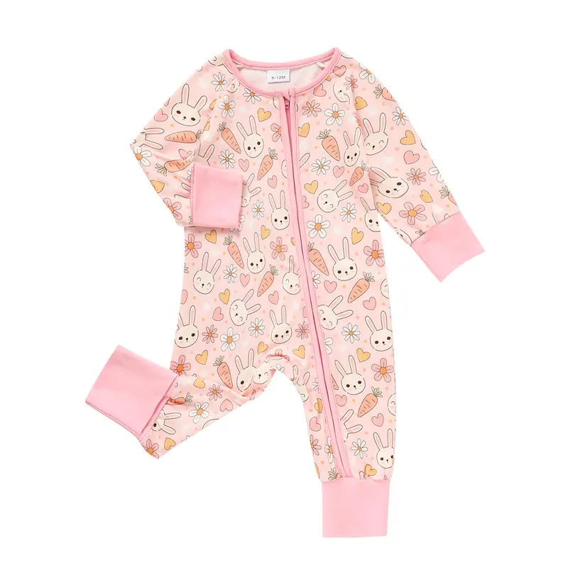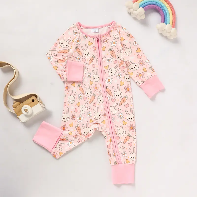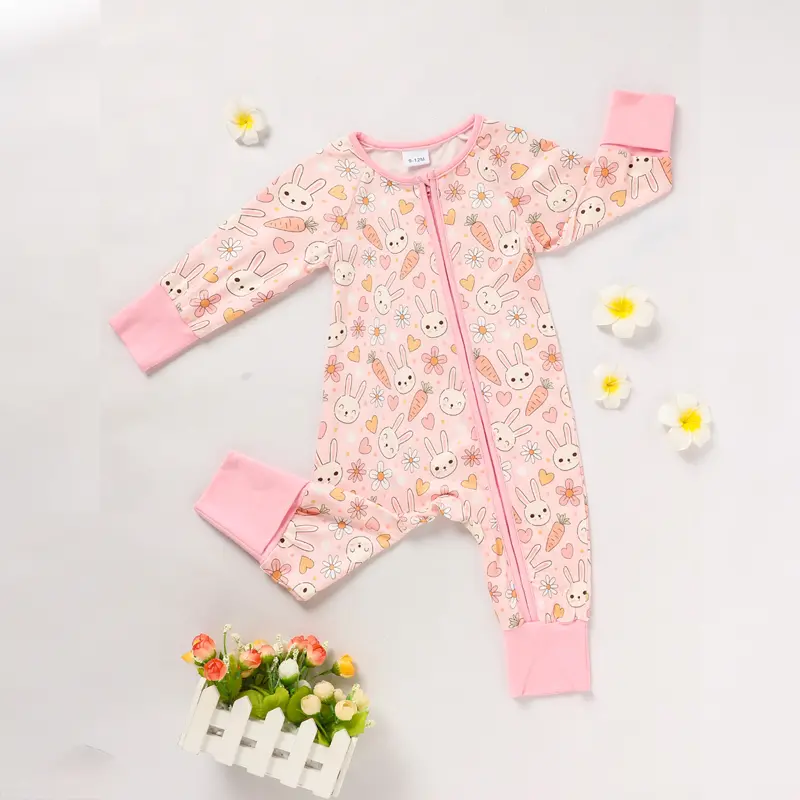 Celebrate spring's arrival with our adorable Baby Girl's Easter Bunny Romper, featuring charming rabbit and carrot prints perfect for Easter festivities and outdoor adventures. This practical one-piece includes a comfortable round neckline, long sleeves for coverage, and a convenient full-length front zipper that makes dressing and diaper changes quick and easy. The playful design and soft fabric ensure your little one stays comfortable whether attending holiday gatherings, enjoying family photos, or exploring outdoors during the beautiful spring season.